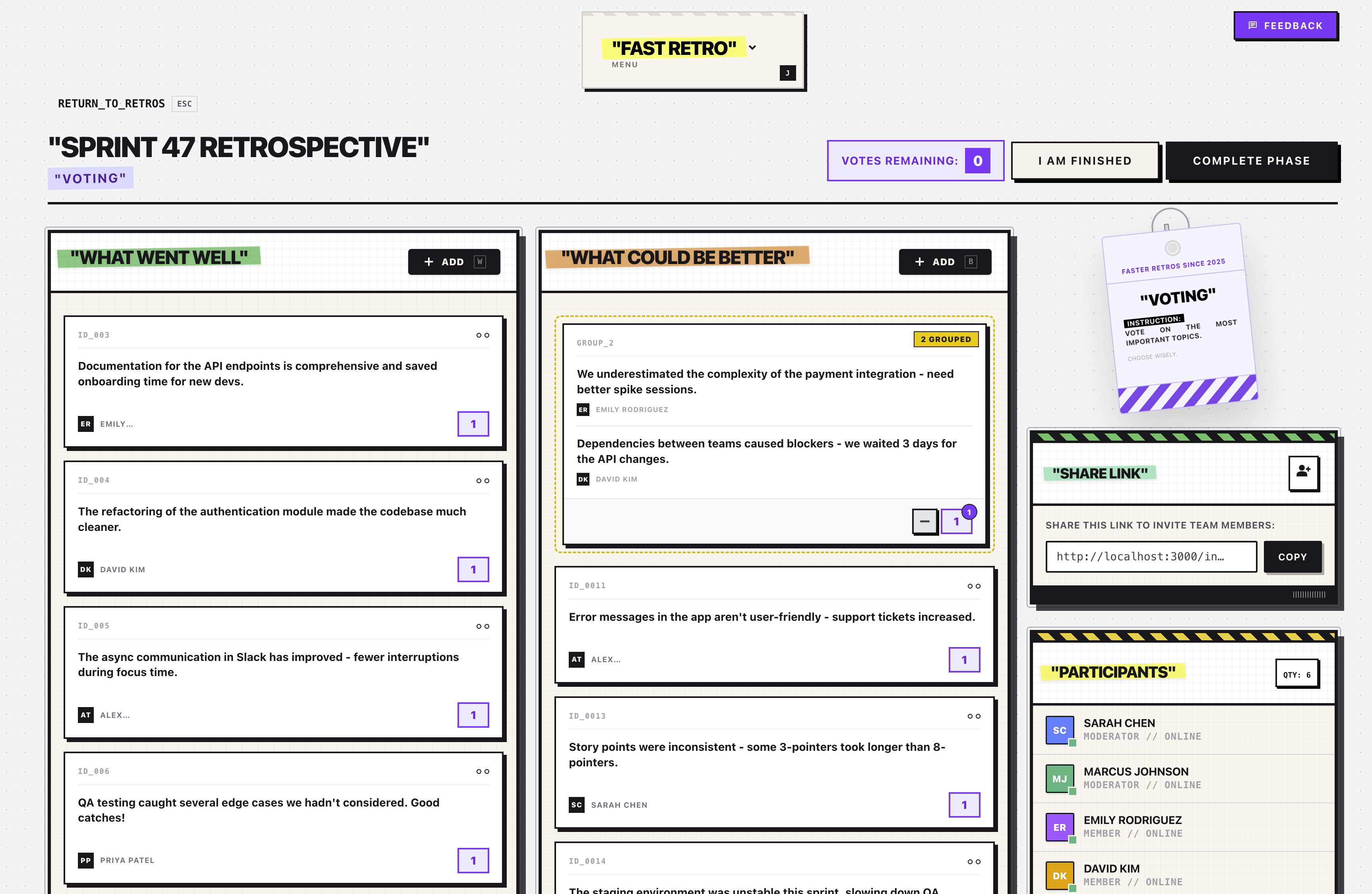 Create a retro, invite your team via link, and guide everyone through four phases: brainstorming (collect ideas anonymously), grouping (organize similar items), voting (prioritize what matters), and discussion (talk through top items and create action items).
